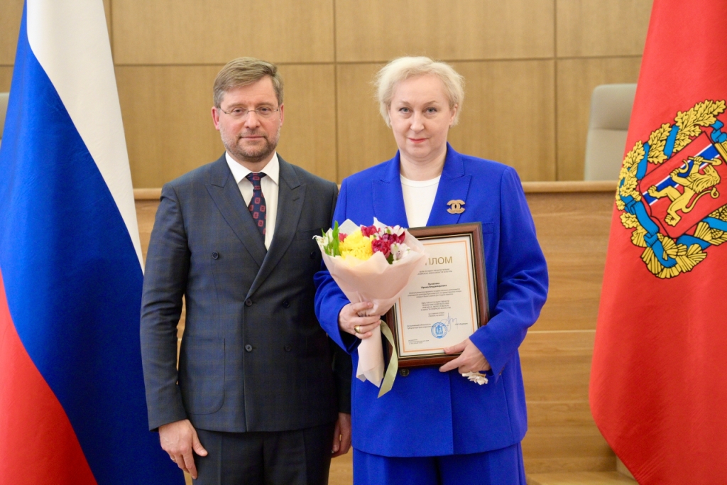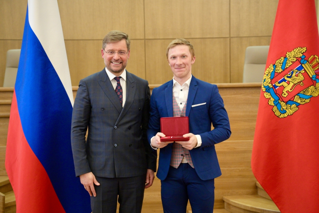 Председатель правительства Красноярского края Алексей Медведев вручил Ирине Лычагиной диплом лауреата Государственной премии Красноярского края в области оперного искусства, Георгию Болсуновскому – знак и удостоверение заслуженного артиста Красноярского края.